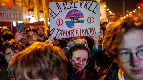 Délután négykor gyűltek össze a civilek a Kálvin téren, hogy mutassák, hogy nem értenek egyet a tanárokat szívató törvénnyel. A tüntit diákok és tanárok szervezték. Azt mondták: “Tanárok, oktatók, segítők, diákok, szülők és mindenki, akinek fontosak az emberi jogok! Tartsunk össze, lépjünk fel a kisstílű bosszú és az elnyomó kormány ellen!”